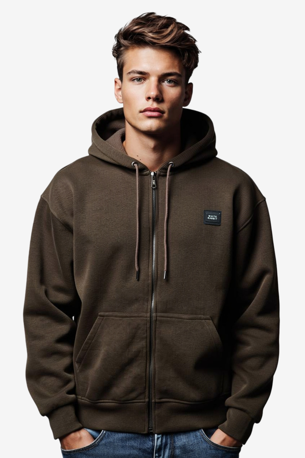 Basic Inner Fleece Zip Through Hoodie-Brown